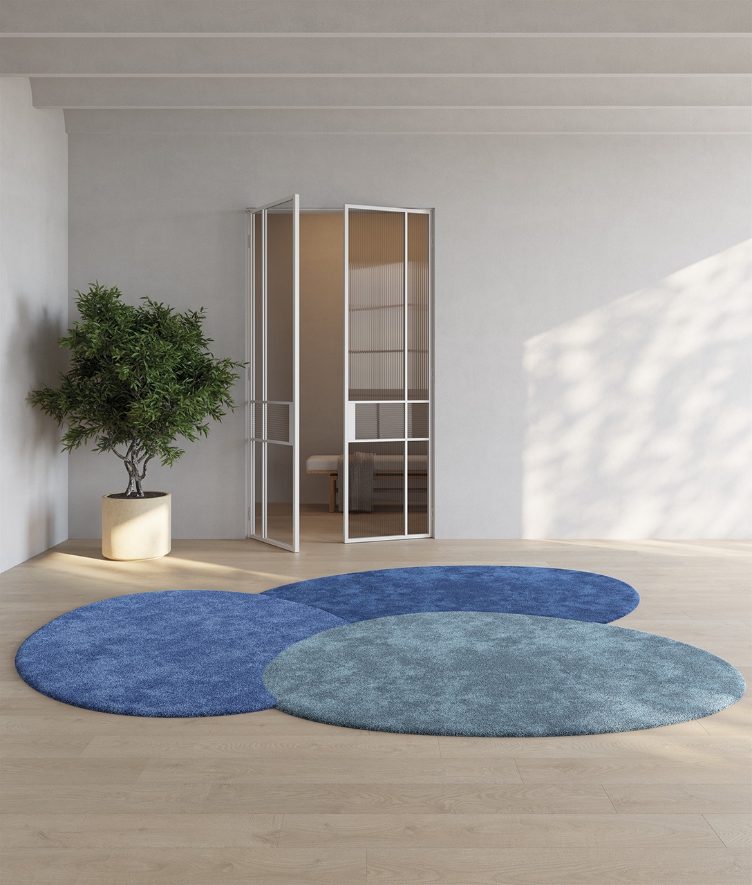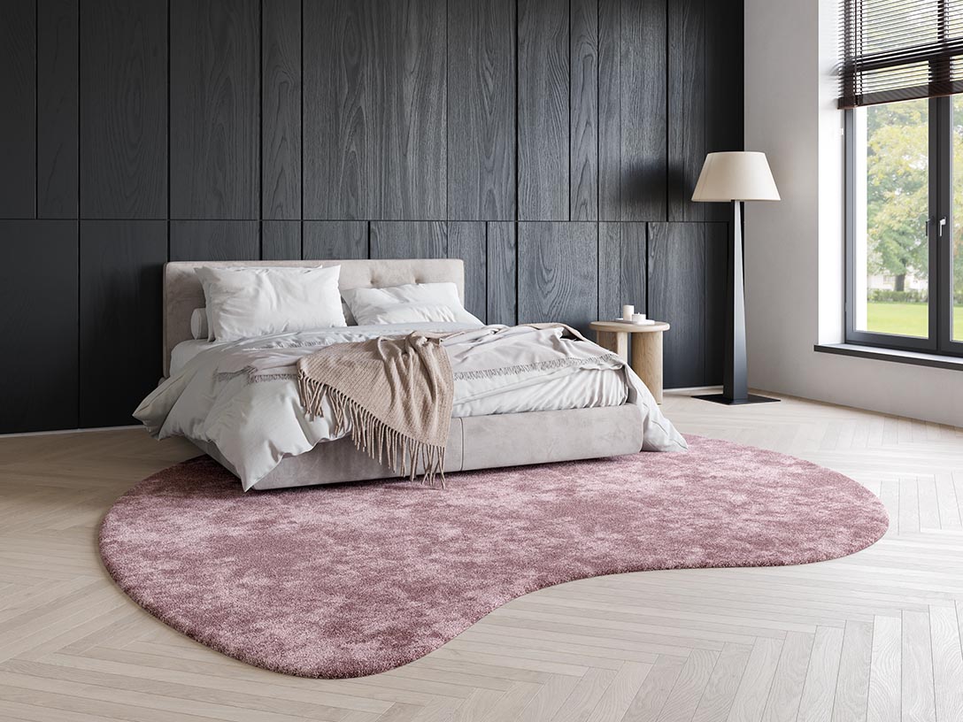 Die Teppiche der Kollektion Rugs & Shapes lassen sich in Form und Größe individuell gestalten. Freie Formen mit eleganten Schwüngen – der Fantasie sind keine Grenzen gesetzt. Um einen elegangen Übergang zwischen Teppich und Bodenfläche zu gewährleisten, sind die Teppiche so konstruiert, dass der Flor sanft über die Kante fällt.